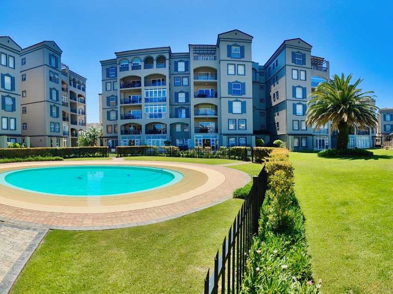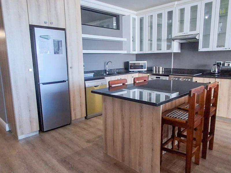 Beachfront coastal living at Diaz Beach: walk to restaurants and waterpark, enjoy 180° bay and Seal Island views from a covered balcony, modern kitchen and resident pool.