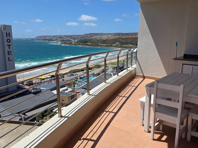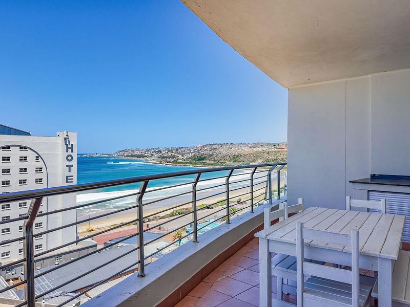 Coastal convenience steps from Diaz Beach and lively attractions, with a private balcony and access to a rooftop communal braai and views — ideal one-bedroom, one-bath with covered parking.