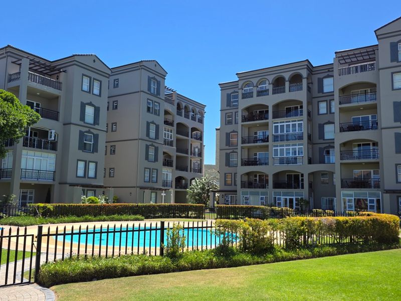 Coastal living at The Beach Club, Diaz Beach — wake up on a private balcony with Seal Island and Outeniqua Mountain views. Two bedrooms, two en-suites, secure parking.
