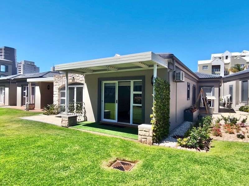 Seaside holiday living at Diaz Beach, Mossel Bay — minutes from white sands and surf. Fully furnished townhouse with versatile enclosed patio overlooking garden and communal pools; three beds, two baths.