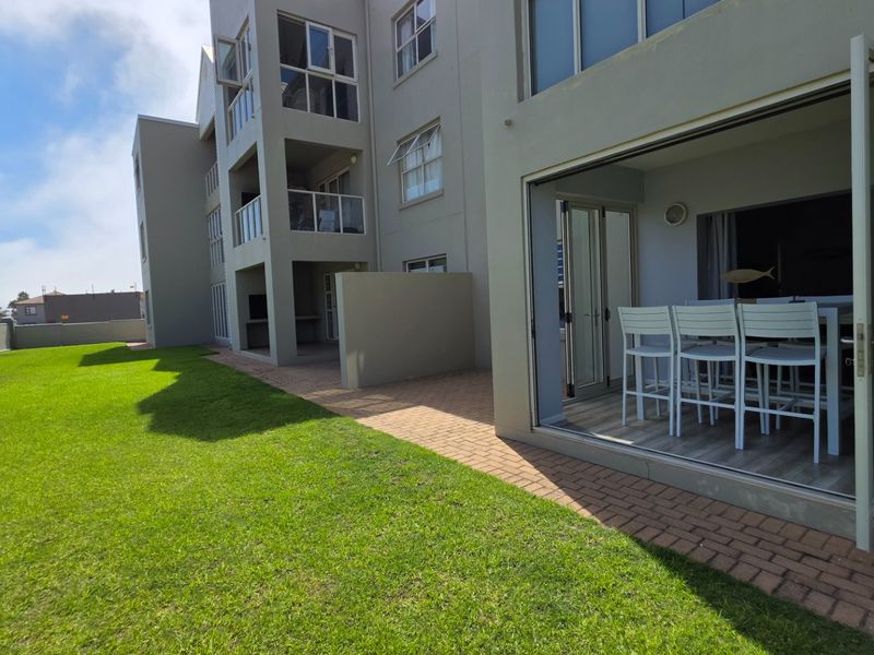 Beachside holiday living steps from Diaz Beach, shops and waterpark — ground-floor apartment with enclosed veranda and built-in braai, two bedrooms, one bathroom, shaded parking.