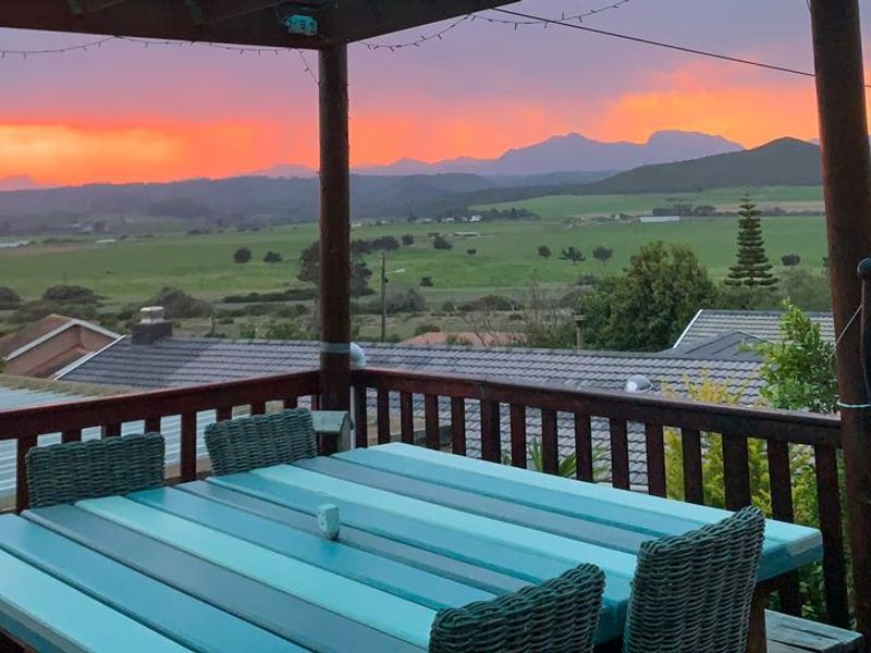 Relax with panoramic Outeniqua mountain and valley views in Kleinbrak, Mosselbaai — open-plan living, large kitchen and patio with braai, established garden; three bedrooms, two bathrooms, automated three-car garage.