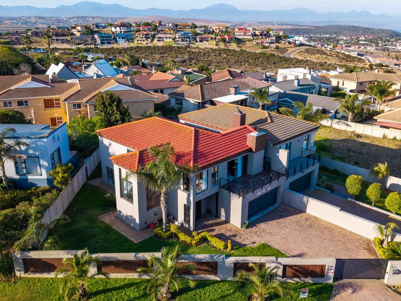 Coastal entertaining lifestyle in Menkenkop, Mossel Bay — open-plan living flows to a sea-view balcony with built-in bar and braai, private garden; four bedrooms, two bathrooms, double garage.