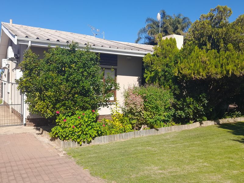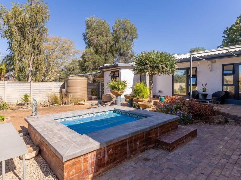 Enjoy relaxed Westbank living in Oudtshoorn with a private irrigated garden and bird-attracting water feature, plunge pool and built-in braai — four beds, 3.5 baths, double garage.