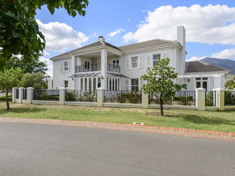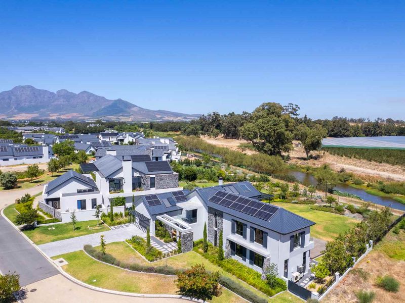 Tranquil country living in Val de Vie Estate, framed by olive groves and mountain views; entertainer's covered patio with built-in braai, four bedrooms, four bathrooms, double garage.