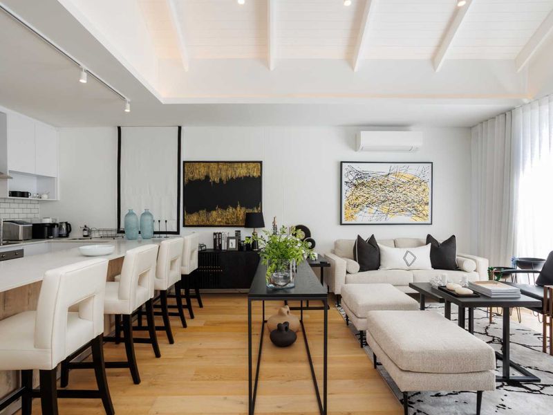 Enjoy Val de Vie estate living with polo fields, trails and restaurants — north-facing Ambrosia apartment offered fully furnished, double-volume living with exposed beams, two bedrooms, two bathrooms, two parking bays.