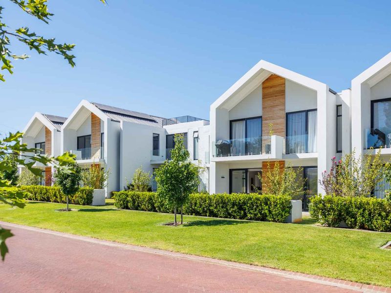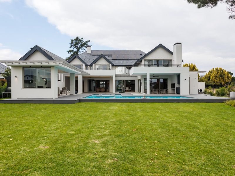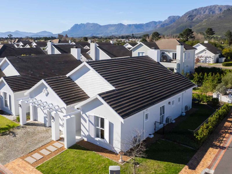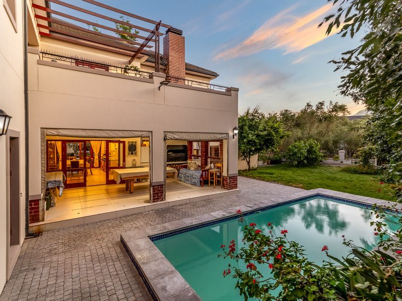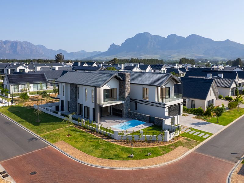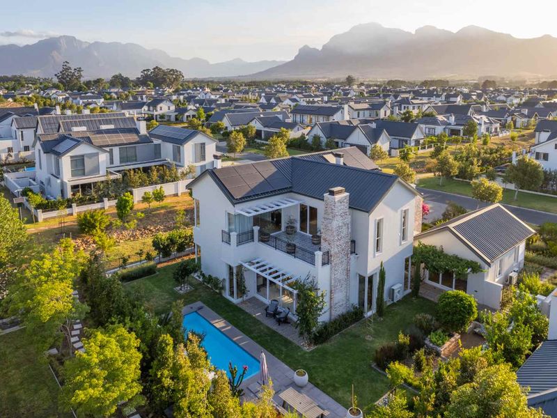 Entertainer's retreat in Val de Vie Estate, living amid Cape Winelands vistas with landscaped gardens and an eight-metre lap pool — four en-suite bedrooms and four covered parking spaces.