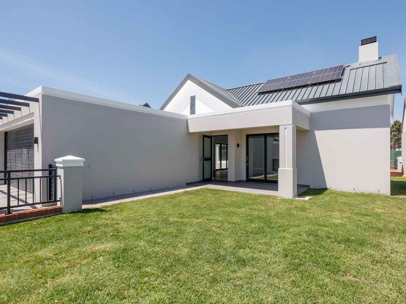 Retire in Val de Vie Evergreen — effortless entertaining with braai room and covered patios opening to garden, plus Lifestyle Centre access. Three beds, two baths, double garage.