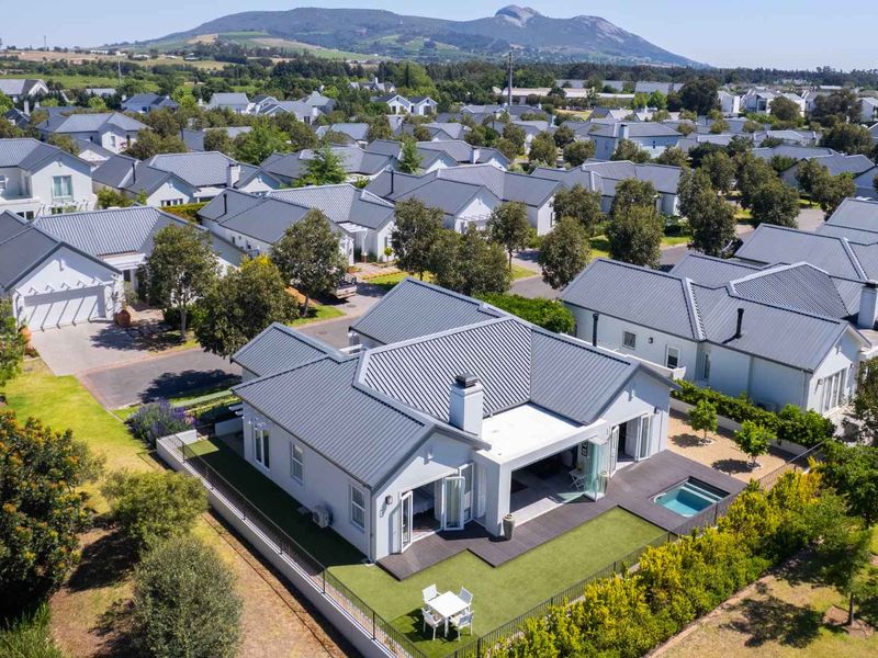 Entertain effortlessly in a private cul-de-sac at Val de Vie, with paddock and mountain views, pool and putting green — four en-suite bedrooms and double garage.