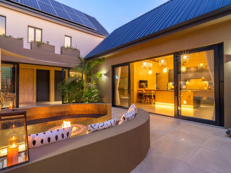 Relaxed, eco-conscious living in Le Domaine: leafy corner garden home with indoor braai flowing to decked saltwater pool, wooden fireplace, three bedrooms and double garage.