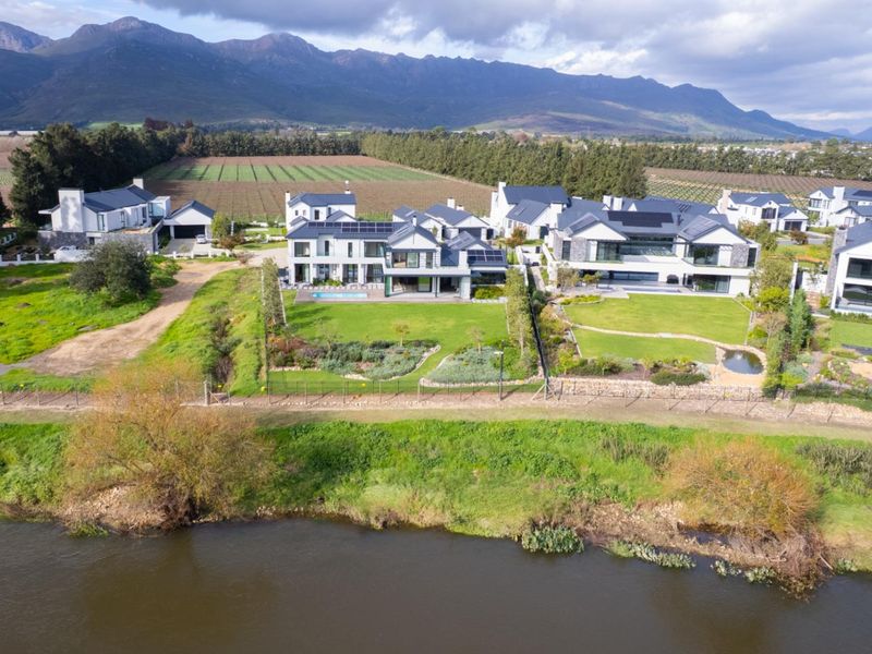 Design a private Winelands sanctuary in Val de Vie Estate, bordering the Berg River with panoramic mountain views; ideal for a riverside equestrian estate with mature vineyards.