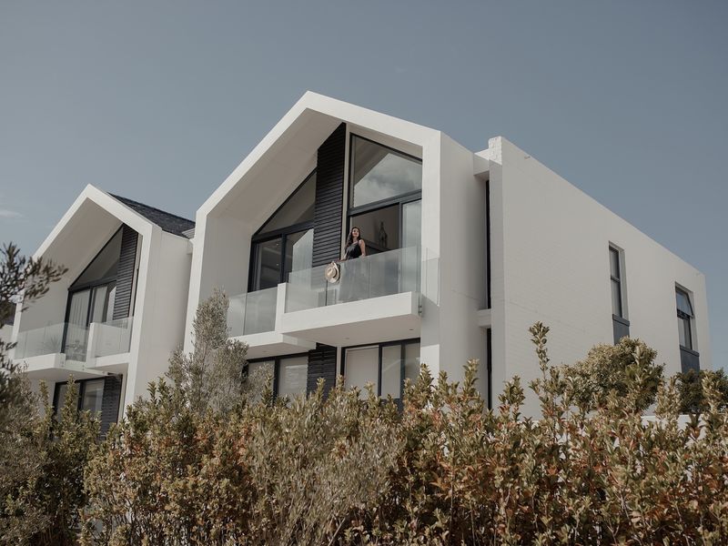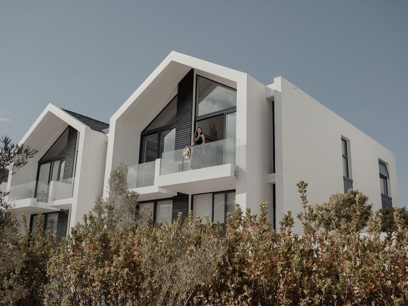 Live resort-style in Val de Vie Estate — contemporary two-bedroom apartment with SMEG kitchen, Sonos, dual balconies framing Drakenstein and Simonsberg views; covered and open parking.