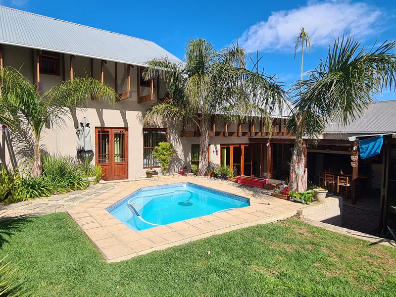 Entertainer's family retreat in historic Swellendam near Bontebok Reserve, with a paved courtyard and pool for summer gatherings, open casual living and seven en-suite bedrooms with two covered parking.