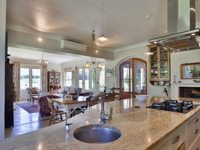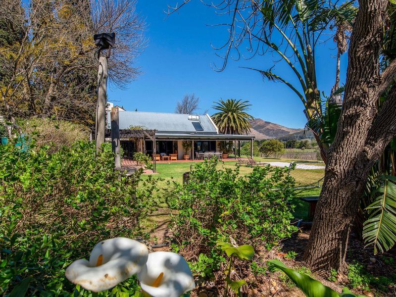 Enjoy morning coffee on a wrap-around stoop facing the Winterhoek peaks in Tulbagh Valley; entertainer's home with renovated country kitchen, designer pool, separate studio flatlet and three bedrooms.