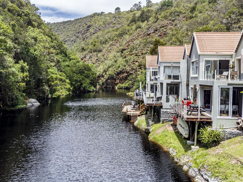 Riverfront retreat in exclusive Gregdale above Kaaimans River, minutes from Wilderness village and beaches — open-plan living with gas fireplace, undercover braai patio and expansive river deck; three bedrooms, three bathrooms.