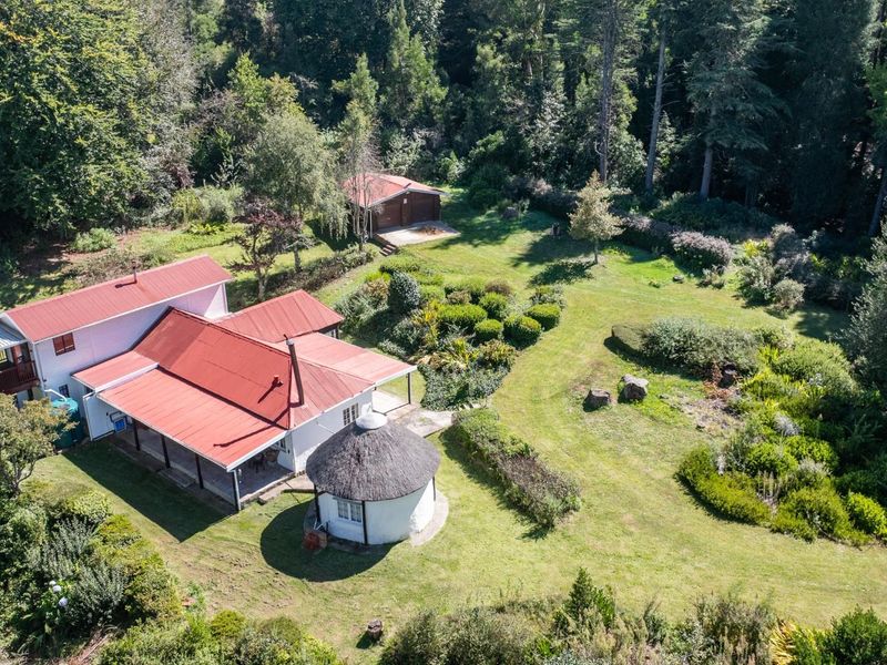 Escape to Hogsback tranquility with mature trees, abundant wildlife and four private waterfalls; soulful dual-living home with rondavel, covered patio and five bedrooms (three baths), sold furnished.