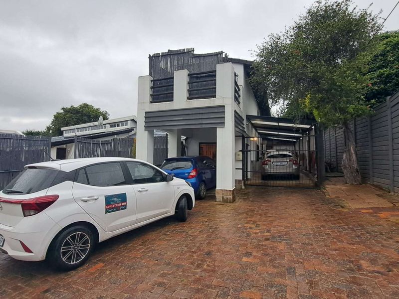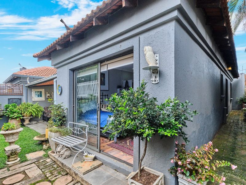 Effortless indoor-outdoor living in a private, secure three-unit complex — covered patio with built-in braai and lush garden, designer kitchen with gas hob, study, tandem garage.