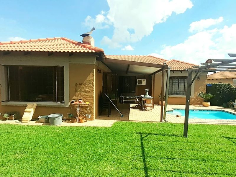 Mediterranean family living with private splash-pool and irrigated garden in Moregloed, within easy reach of University of Pretoria, Hatfield and the N1; four bedrooms and two bathrooms.