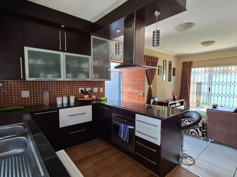 Relaxed lock-up-and-go living in Ruimsig, steps from shopping and Nova Pioneer; private walled garden with built-in braai, communal pool, 24-hour security — two bedrooms, one bath, single carport.