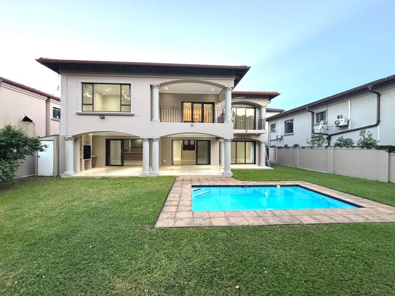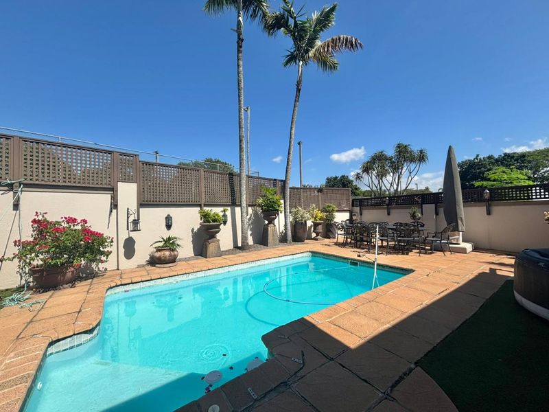 Country-club lifestyle in Umhlali Golf Estate's The Oval, walk to Umhlali Country Club; single-level entertainers' home with pool, enclosed bar patio and private garden. Three beds, three baths, triple garage.