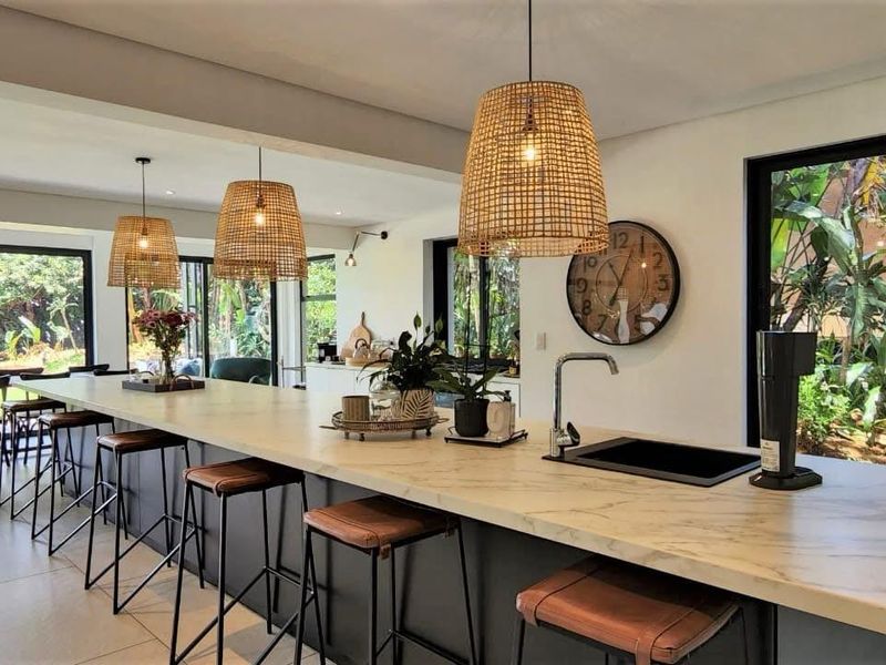 Resort-style living in Zimbali Estate with beaches, golf and spa access; open-plan spaces flow to decks with unobstructed sea views, koi-filled rock pool, and four beds, 4.5 baths.