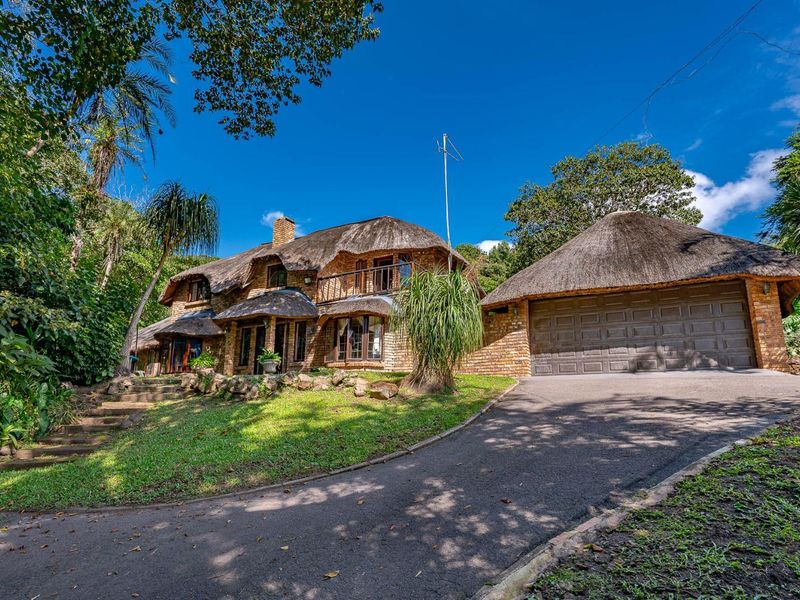 Treetop family retreat overlooking a lush greenbelt, perfect for weekends around a bubbling stream and rock pool; thatch home with rustic bar, three beds, 2.5 baths, double garage.