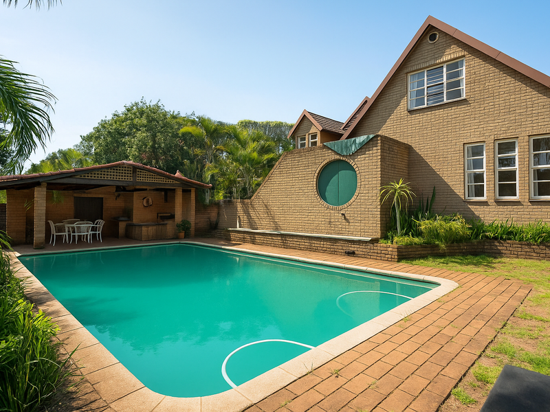 Relaxed coastal living in Widenham, Umkomaas with enclosed pool and jacuzzi for entertaining, sunroom courtyard and indigenous garden — freestanding home with attic office, three beds, three baths.