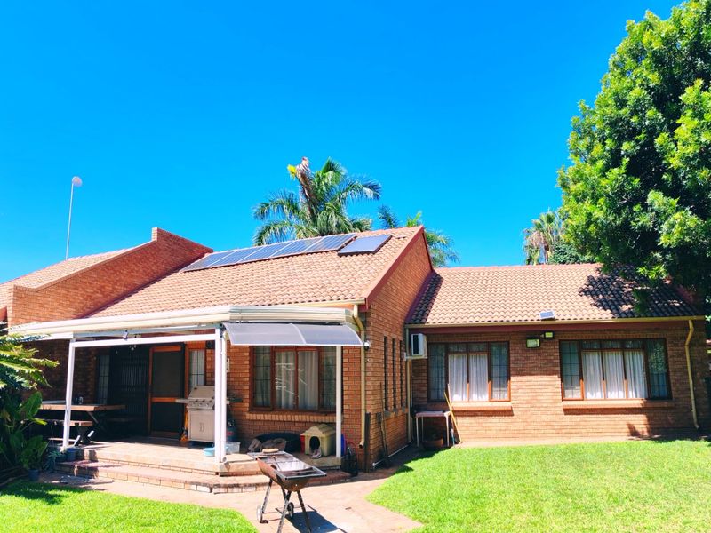 Relaxed gated estate living in Palmeira, Bela Bela — private corner plot overlooking a lush green strip, landscaped backyard and covered patio for entertaining. Three bedrooms, two bathrooms, double garage.