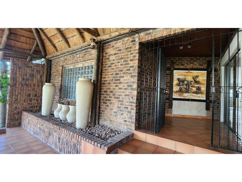 Lowveld retreat near KaNymanzane Road in Karino — established garden with towering palms, ideal for hospitality. Enjoy a black pool with waterfall and thatch lapa; eight bedrooms, five baths.