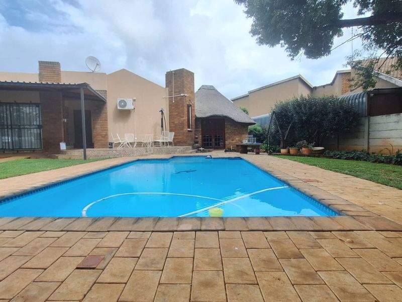 Relaxed family living in Meiringspark, Klerksdorp, in a quiet suburb close to schools, with pool and lapa featuring built-in braai and bar; three beds, two baths, single garage.