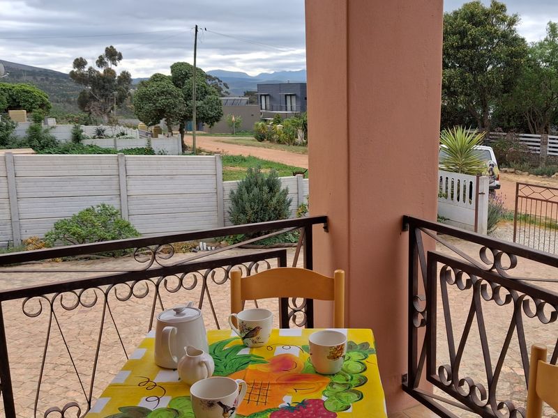 Wake up to sunrise over vineyards and mountains in Botriver — expansive deck and uninterrupted steam-train views, off-grid comforts with solar and tanks; three-bedroom home with self-contained flatlet.