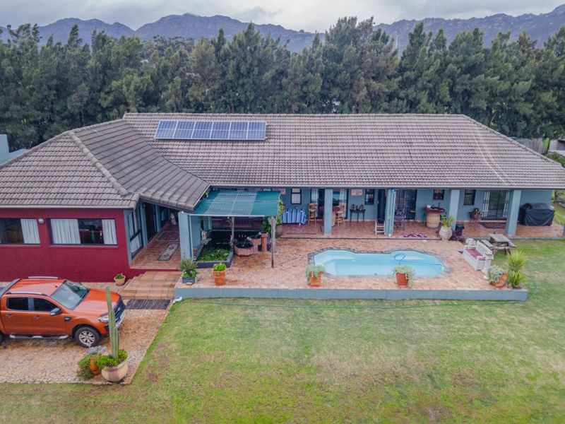 Embrace country smallholding living in Firlands with Helderberg mountain views from a wraparound balcony; dual-living layout offers three bedrooms, three baths, and two garages — development potential.