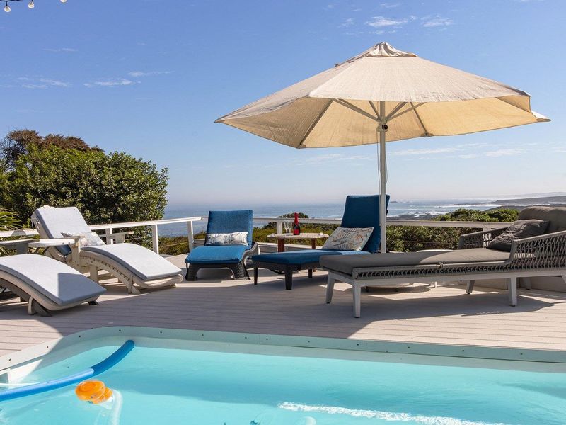 Relaxed coastal living in Grotto Bay Private Nature Reserve, steps from fynbos trails and beach. Expansive patio with pool and sea views, plus a double-view fireplace; five beds, four baths.