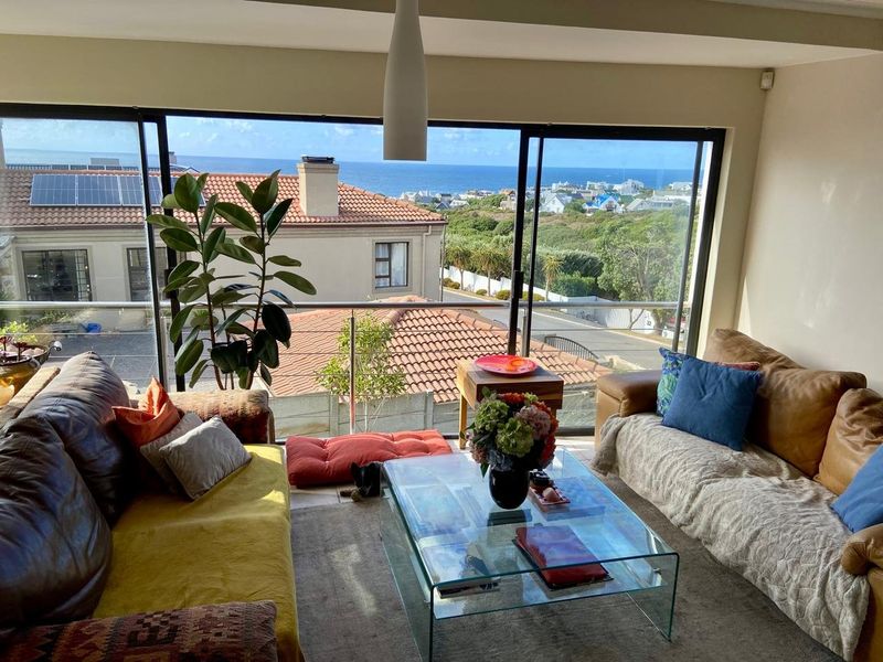 Coastal living in Vermont, Hermanus lifestyle minutes from the ocean, opposite a lush greenbelt with mountain views; sunlit double-volume lounge opens to deck, plus versatile outside room and solar power.