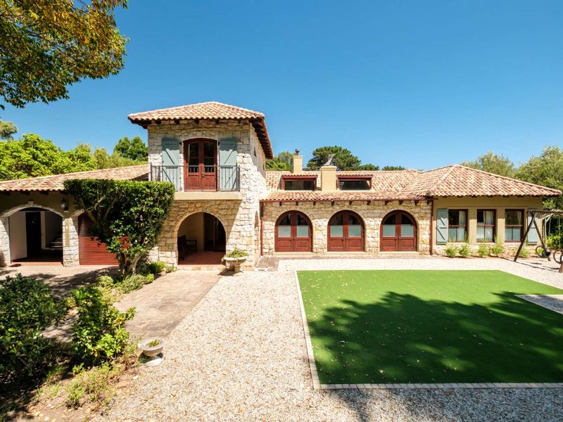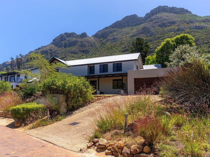 Exclusive mountain-and-sea retreat in Ruyteplaats Mountain Estate, Hout Bay — privacy, secure communal gardens and trails, solar-heated pool and private putting green. Five bedrooms, three garages.