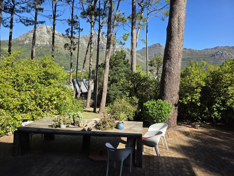 Peaceful, forest-like retreat in leafy Hout Bay with mountain views, double-volume living and large patio for entertaining, private pool and fully furnished interiors — three bedrooms, two bathrooms.