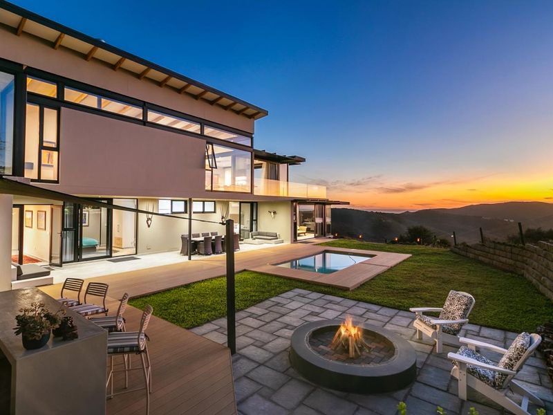 Entertainer's coastal retreat in Fernwood overlooking Knysna Lagoon and colourful sunsets; open-plan living flows to BBQ deck with built-in concrete bar and boma. Three en-suite bedrooms, double garage.