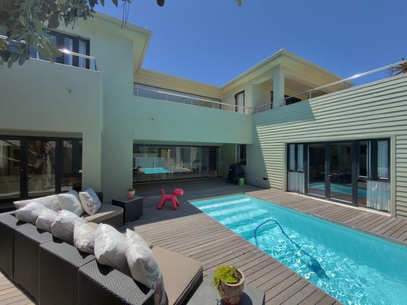 Beachside entertainer's dream moments from the shore, soaking in Atlantic sounds and Table Mountain views; indoor pool with frameless stacking glass doors—five beds, five baths, triple garage.