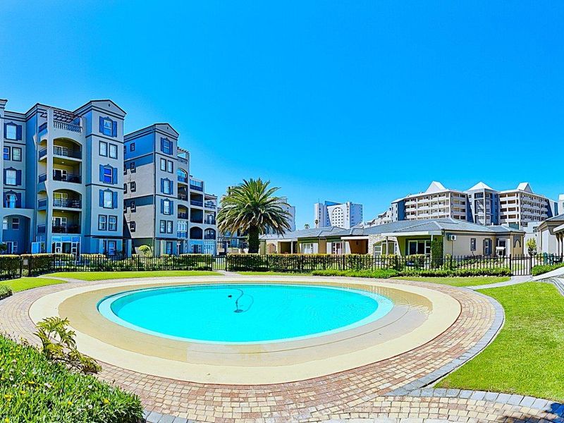 Beachfront coastal living at Diaz Beach: walk to restaurants and waterpark, enjoy 180° bay and Seal Island views from a covered balcony, modern kitchen and resident pool.