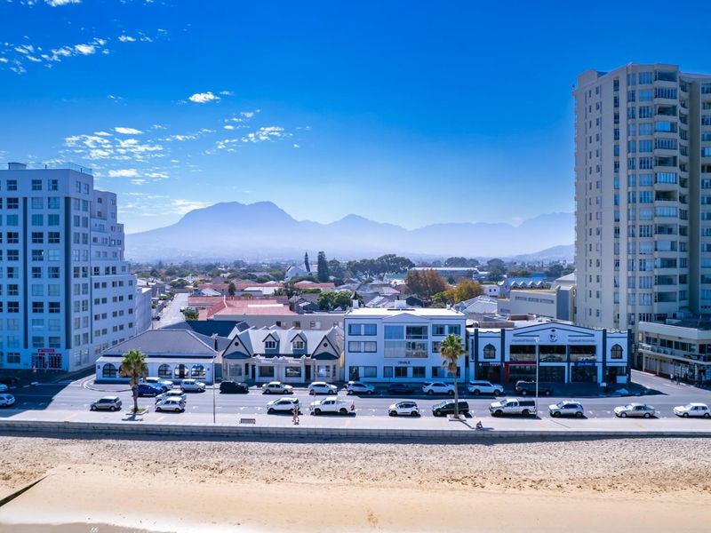 Coastal lifestyle in Strand North with effortless entertaining on a large covered balcony overlooking sea and mountain views; open-plan 3-bedroom, 2-bath apartment with garage and parking.