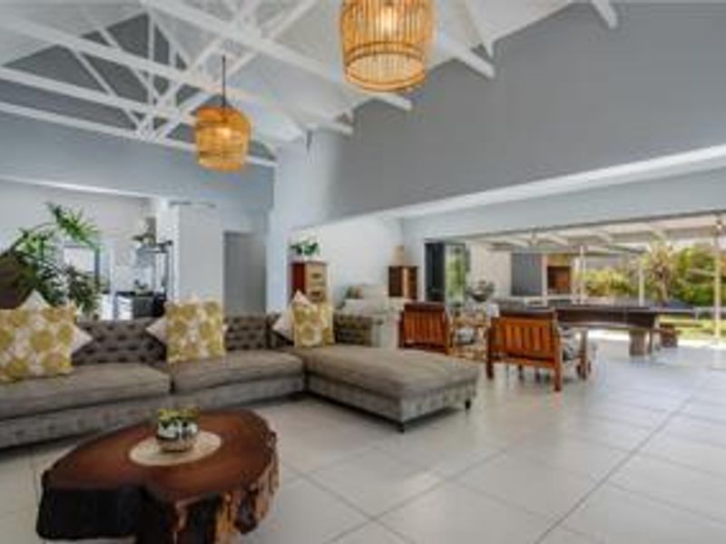 Privacy-focused living at the panhandle end, steps from peaceful streets and leafy views, with a covered outdoor braai, modern kitchen island, four bedrooms, five bathrooms and single garage.