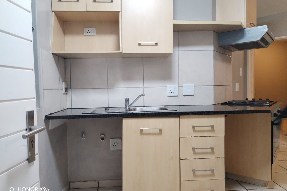 Step inside to a bright, open-plan kitchen and living area. The kitchen offers an electric stove, oven, hob, space for one under-counter appliance, plenty of cupboard storage, and stylish granite countertops. The living area flows seamlessly to the communal backyard through a sliding door, creating a light and open feel that’s perfect for everyday living.