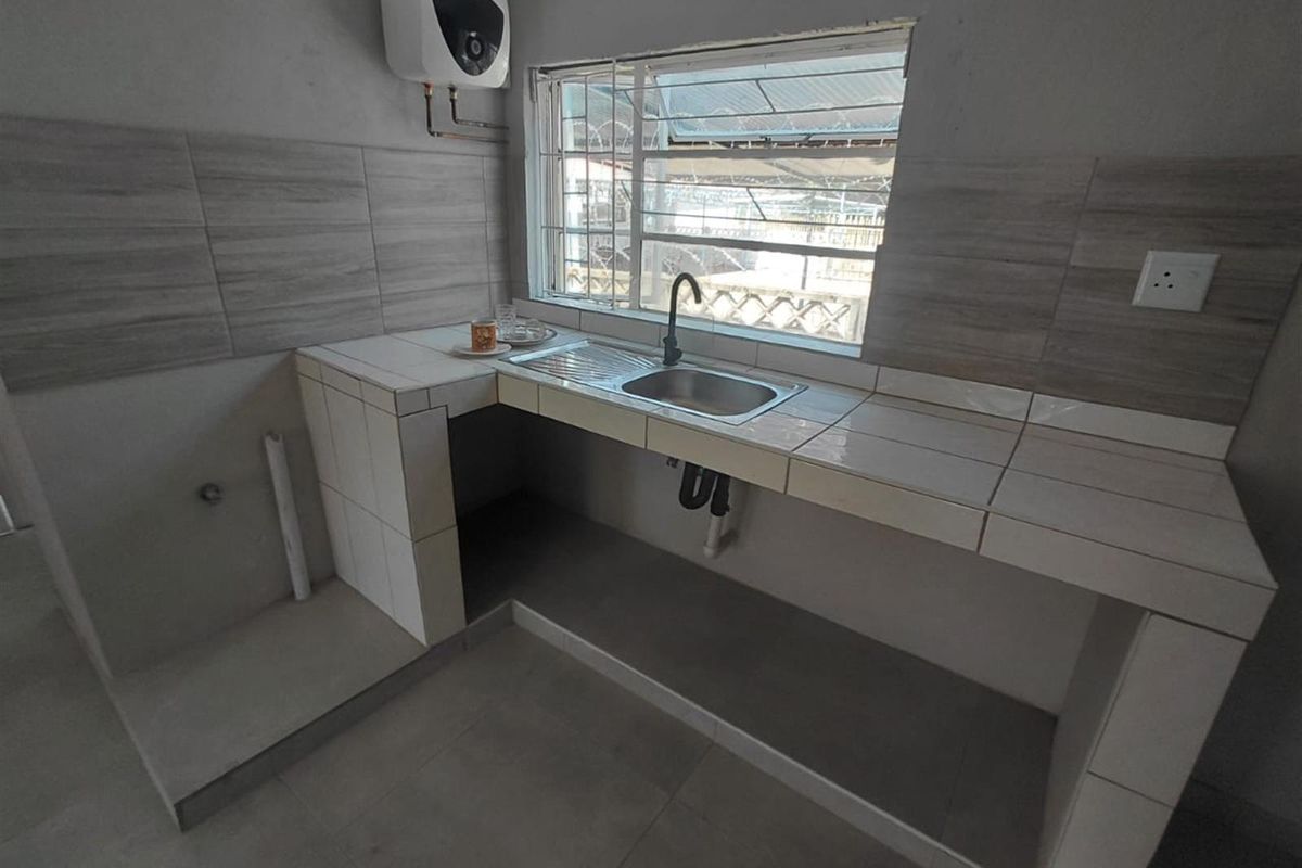 The kitchen features tiled countertops, a stainless-steel sink, ample workspace, and a convenient under-counter area for appliances. A large window allows for plenty of natural light, creating a bright and welcoming cooking space and light in the lounge as its conveniently open plan. A fitted geyser ensures reliable hot water throughout the unit.
