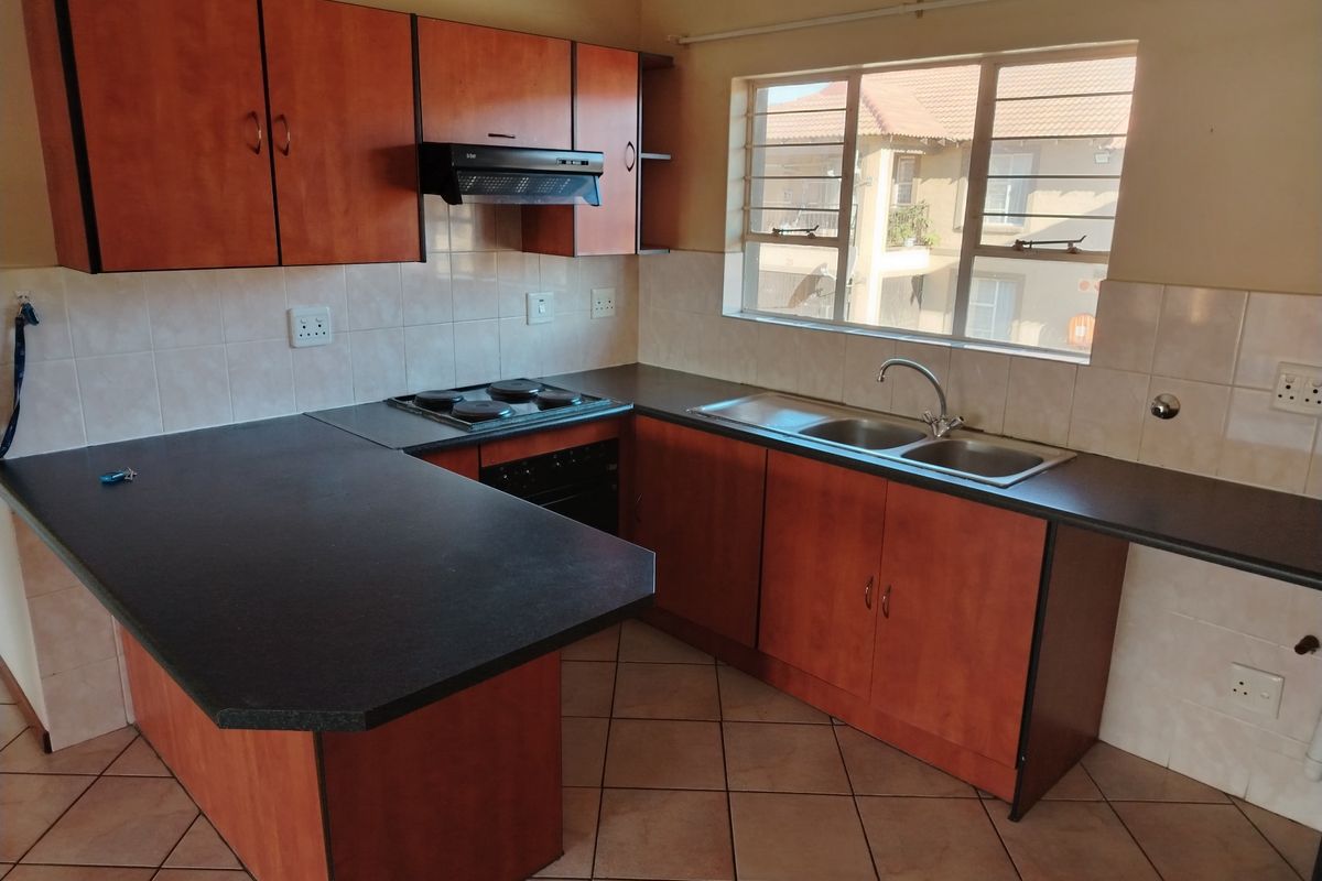 Relax in a secure, family-friendly complex near Carnival Mall and Carnival City — open-plan living with a balcony braai, play area, two bedrooms, one bathroom and covered carport.