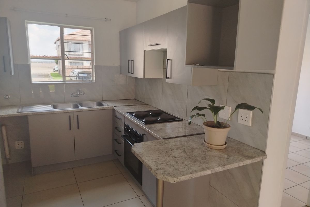 Commuter-friendly living near Johannesburg with quick highway access and East Rand Mall nearby. Ground-floor flat opens to a private patio and small garden, pet-friendly, two beds, one bath, covered parking.