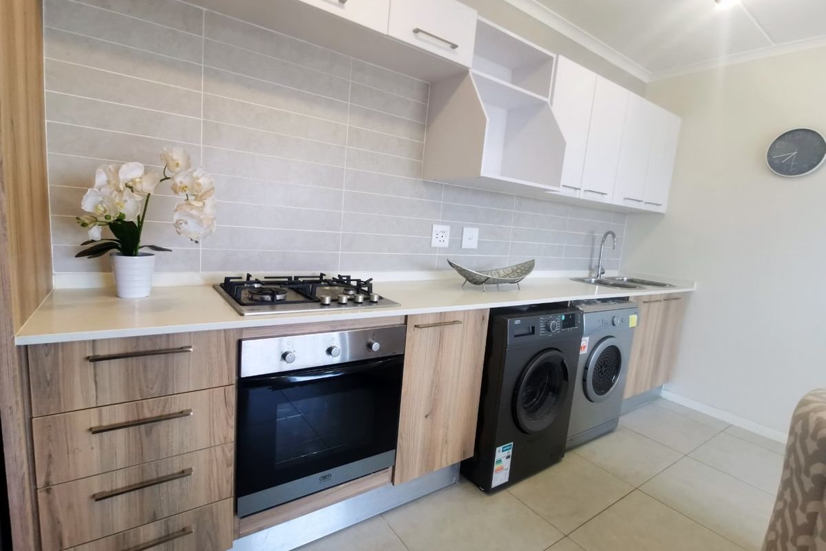 Relaxed urban lifestyle near Flamingo shopping centre and wetlands lake, featuring luminous open-plan living and a gas braai balcony — one-bedroom, one-bath apartment with fibre and security.