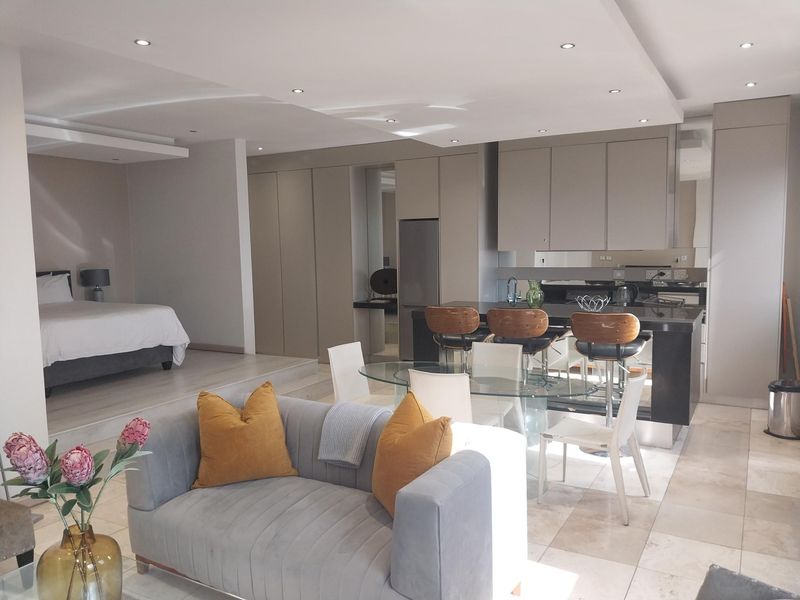 Urban convenience in Franklin building near Newtown Junction and FNB Bank City — secure 9th-floor bachelor with fitted kitchen, bathtub, sleek TV unit and covered parking.