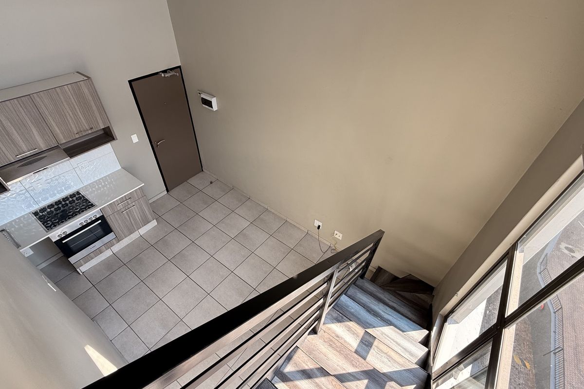 Lock-up-and-go urban living near Rosebank Mall and the Gautrain, with duplex separation for privacy, pool, gym and clubhouse access — two bedrooms, one bathroom, two covered parking.