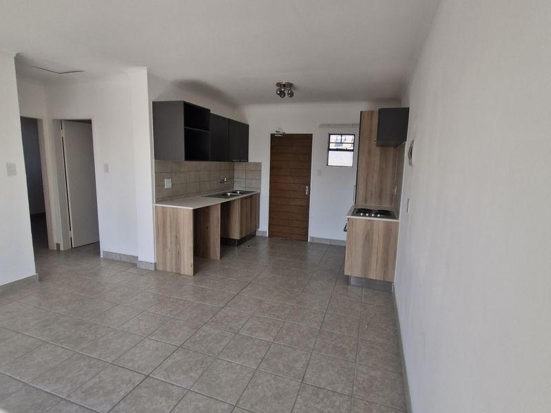 2-bedroom, 1-bathroom apartment in Kempton Park with open-plan kitchen, lounge, balcony, and 2 covered parking spaces.