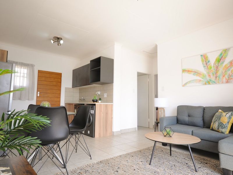 Relaxed park-side living in Modderfontein, steps from reserves and shopping; two-bedroom, one-bath apartment with open-plan modern kitchen, balcony outlook, communal pool and kids' play area.